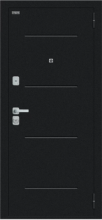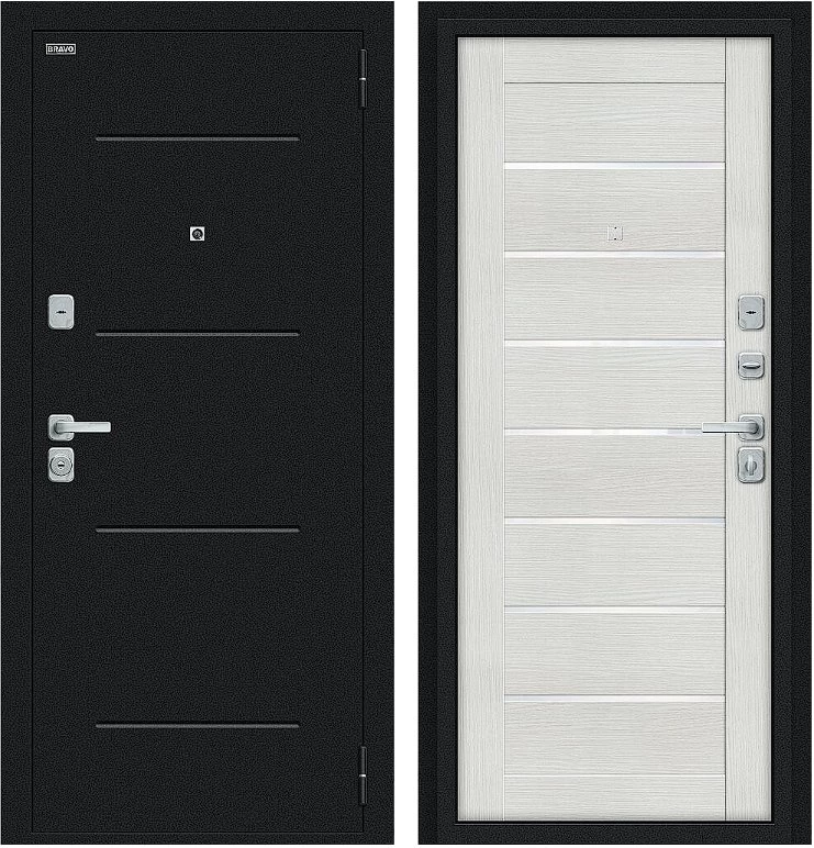 Надежная входная Дверь Браво Техно/BChrome Букле черное/Bianco Melinga премиум класса по цене 35 260 руб. Большая толщина стали защитит от проникновения в ваш дом, квартиру или коттедж. Используется очень качественная фурнитура: замки, цилиндры, ручки, защелки. Покрытие и отделка двери изготовлено под внимательным контролем производителя. Дверь имеет долгий срок службы и гарантию.